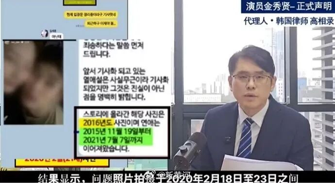 律师在视频中称,金赛纶在成年以及上大学之前,金秀贤未与其交往过。该律师还称,金赛纶家属伪造了两人合照的拍摄时间。两人的交往时间始于2019年夏天之后,也就是金赛纶上大学后,恋爱关系于2020年春天结束,目前所公开的合照时间都是在这段时期拍摄的。金秀贤与金赛纶的贴脸照片拍摄于2020年2月,彼时金赛纶正在上大学二年级,而非高中时期。